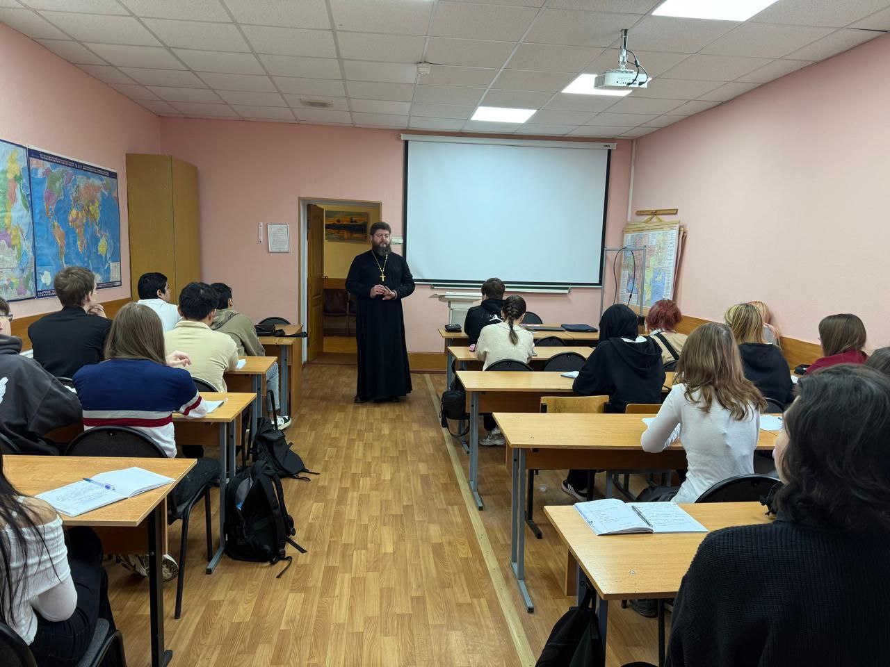 10 ноября 2025 года в рамках дисциплины "Обществознание" клирик Георгиевского храма в городе Видное иерей Олег Осадчий провел для студентов первого курса колледжа беседу на тему: