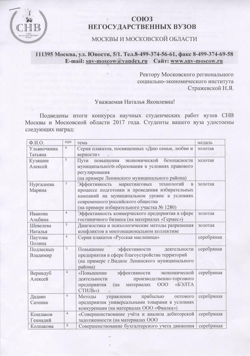 Подведены итоги конкурса научных студенческих работ вузов СНВ Москвы и Московской области 2017 года.