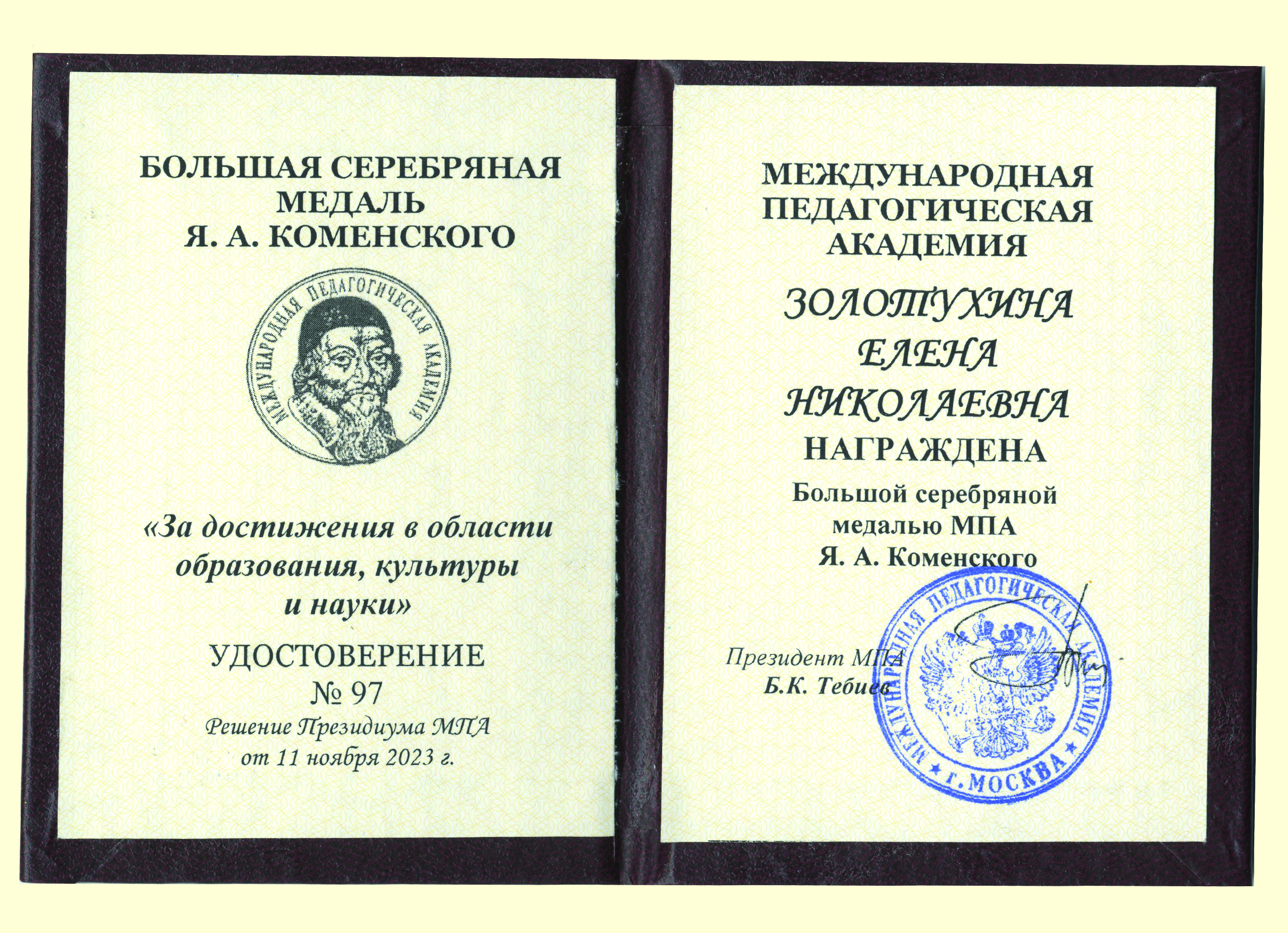 11.11.2023 11 ноября 2023 года за достижения в области образования, культуры и науки Ректор Московского регионального социально-экономического института Золотухина Елена Николаевна награждена Большой серебряной медалью им. Яна Коменского Международной педагогической академии.