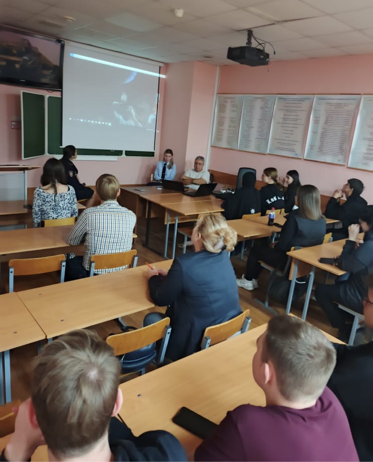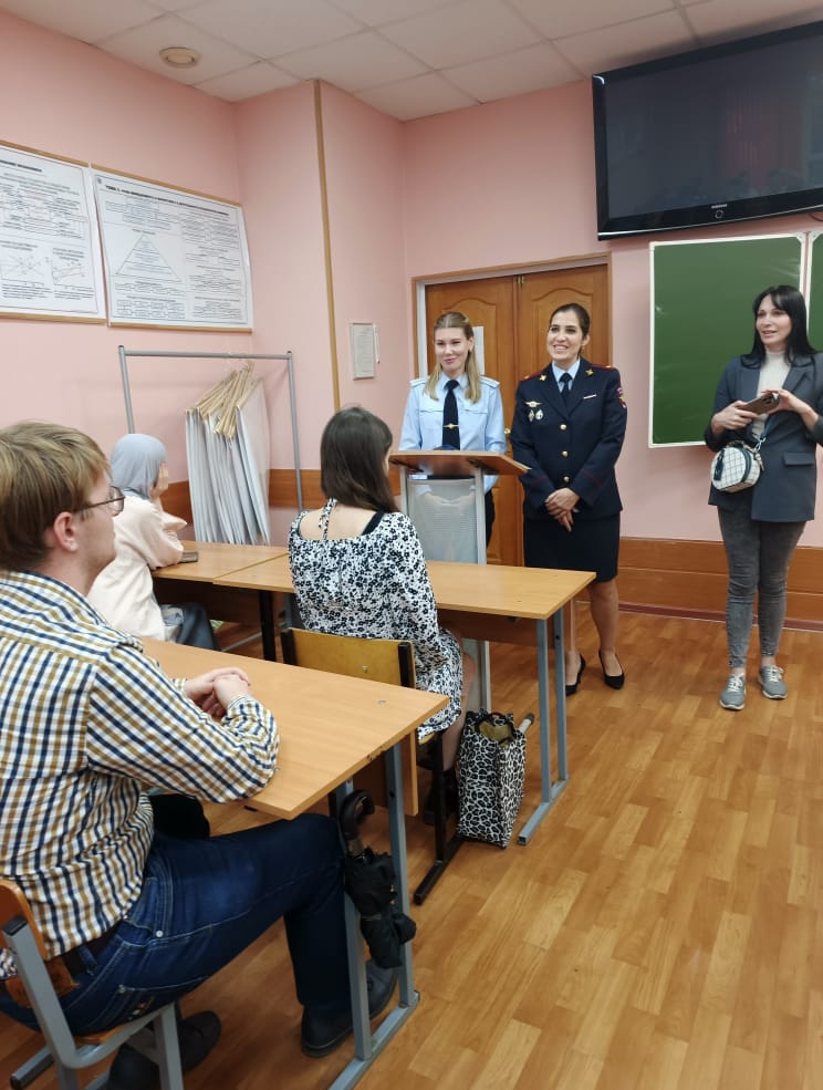30.09.2024 27 сентября состоялась встреча студентов и выпускников с подполковником полиции УМВД по Ленинскому г. о. Лаговской О. Ю., она предложила поступить на службу в органы внутренних дел.