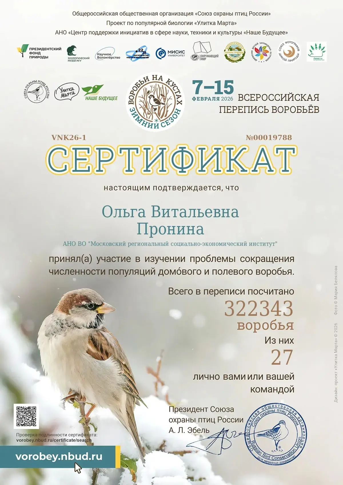 Старший преподаватель кафедры дизайна Ольга Витальевна Пронина приняла участие во Всероссийской переписи воробьёв общероссийской общественной организации